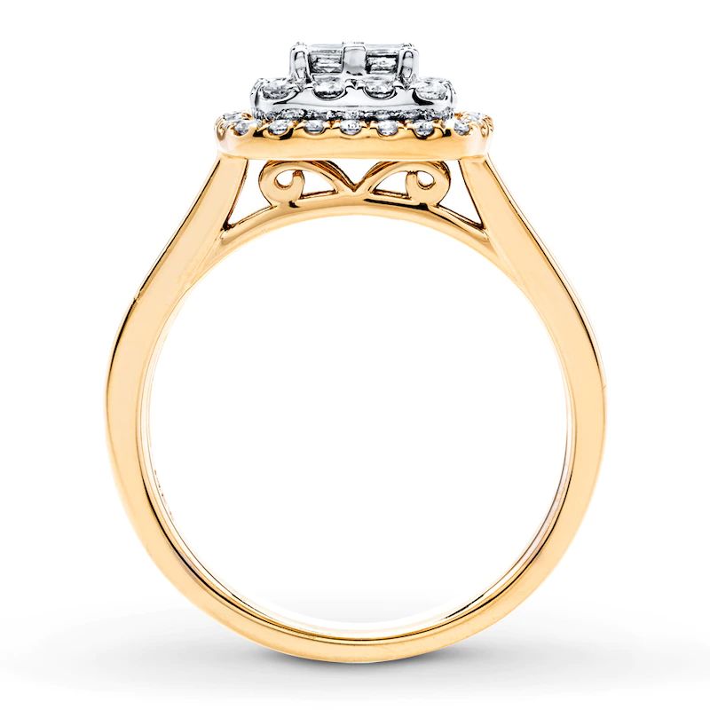 Framed by two rows of round diamonds, four princess-cut diamonds sparkle together in this beautiful engagement ring. The 14K yellow gold band glitters with channel-set round diamonds, bringing the total diamond weight to 3/4 carat. The center diamonds are set in 14K white gold.