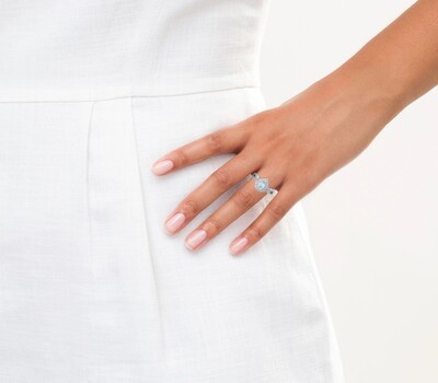 A wintry pear-shaped aquamarine is the striking focal point of this spellbinding ring.