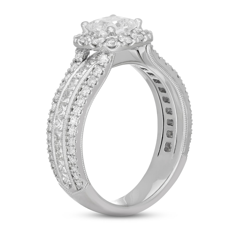 This resplendent engagement ring from Neil Lane Bridal? showcases a glamorous 3/4-carat princess-cut diamond framed in brilliant round diamonds. Three rows of round diamonds shimmer down the band, complemented by classic milgrain accents for a sophisticated look. The ring is styled in iconic 14K white gold and has a total diamond weight of 2 1/8 carats.
