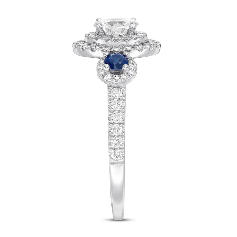Exquisitely styled, this engagement ring from the Vera Wang WISH Collection features a 1/2-carat oval diamond center traced in two rows of round diamonds, and flanked on either side by round natural sapphires, symbols of purity. Additional round diamonds line the band, while princess-cut sapphires enliven each profile to complement the design. Crafted of 14K white gold, the ring has a total diamond weight of 1 carat. Exclusively available at Jared? the Galleria of Jewelry.