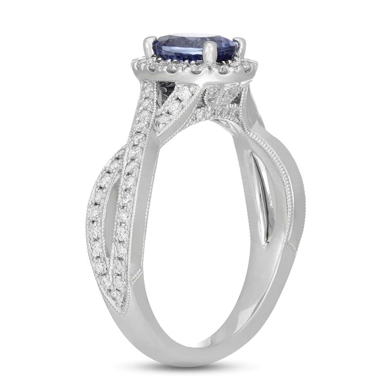 A vivid oval-cut tanzanite draws the eye to this splendid engagement ring from Neil Lane Bridal?. Radiant round diamonds halo the center and shimmer down the twisting 14K white gold band for a total diamond weight of 5/8 carat.