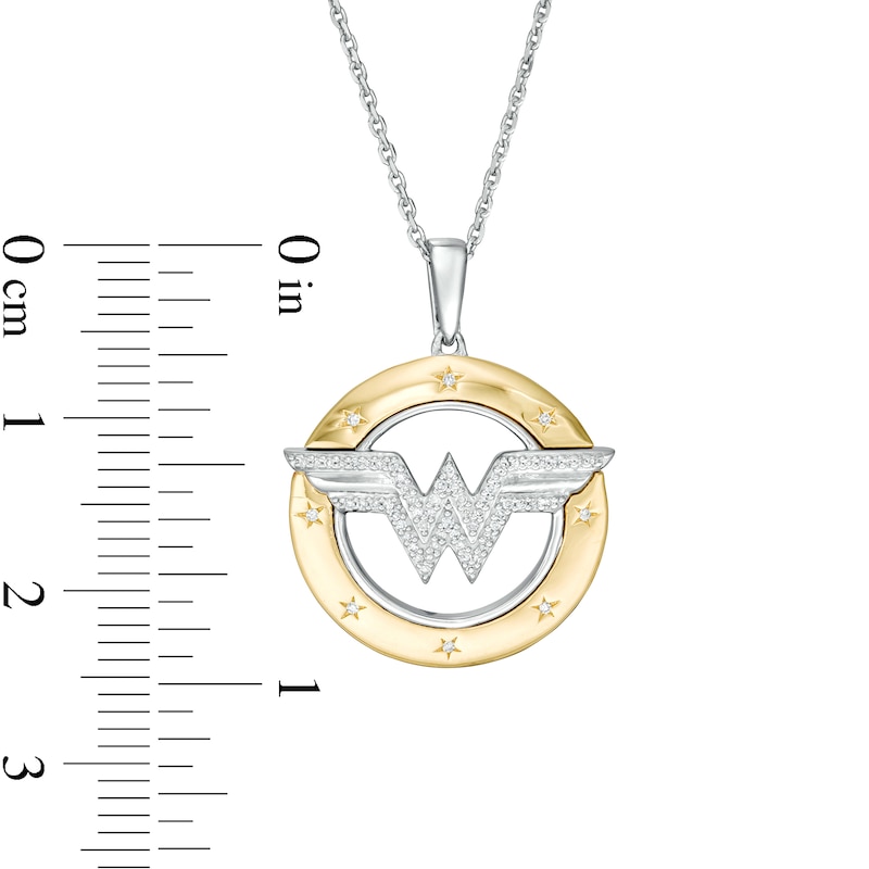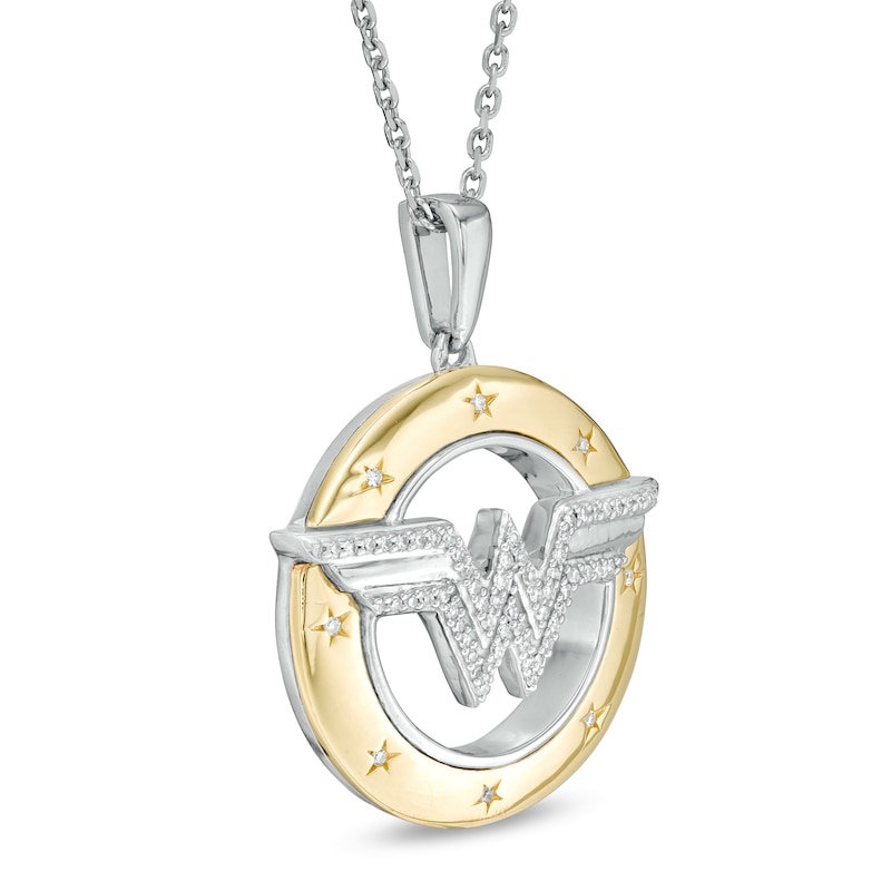 Bring adventure to your wardrobe with this striking diamond circle pendant from the Wonder Woman Collection. Created in sterling silver and 10K gold, this bold design showcases the "WW" logo sculpted in silver and shimmering with diamonds. Etched diamond-touched stars twinkle along the wide gold rim of the open circle border while the slim silver interior highlights the center. Captivating with 1/10 ct. t.w. of diamonds and a bright polished shine, this pendant suspends along an 18.0-inch cable chain, with an additional closure ring at 16.0 inches, that secures with a spring-ring clasp. The Wonder Woman Collection of fine jewelry at Zales is inspired by one of the most beloved and iconic DC Super Heroes of all time. Embodying strength and grace, Wonder Woman is a modern-day warrior. This exclusive fine jewelry collection inspires you to wear your strength, confidence and power.
