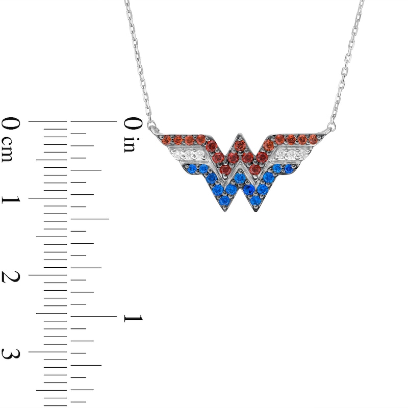 Bursting with action from the Wonder Woman Collection, this gemstone and diamond necklace brings eye-catching color to your fearless style. Crafted in sterling silver, this look showcases the "WW" logo lined in regal red garnets, bright blue sapphires and sparkling diamonds. Captivating with 1/20 ct. t.w. of diamonds and a brilliant buffed luster, this 1.0-inch design suspends centered along a 17.0-inch cable chain, with an additional closure ring at 16.0 inches, that secures with a spring-ring clasp. The Wonder Woman Collection of fine jewelry at Zales is inspired by one of the most beloved and iconic DC Super Heroes of all time. Embodying strength and grace, Wonder Woman is a modern-day warrior. This exclusive fine jewelry collection inspires you to wear your strength, confidence and power.