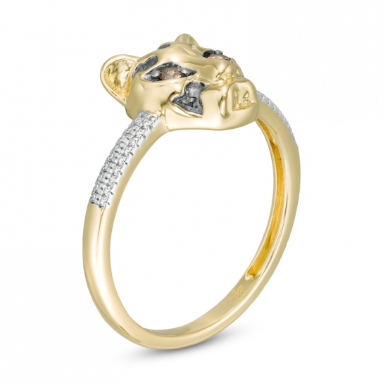 Representing the Super-Villain Cheetah, this diamond ring from the Wonder Woman? Collection captures your fearless spirit. Crafted in warm 10K gold and black rhodium plate, this choice showcases a sculpted cheetah head adorned with alluring champagne diamond eyes and a spot design in black rhodium plate. The double-row shank sparkles with white diamonds to complete the look. Radiant with 1/10 ct. t.w. of diamonds and a brilliant buffed luster, this ring makes a fierce statement. The Wonder Woman? Collection of fine jewelry at Zales is inspired by one of the most beloved and iconic DC? Super Heroes of all time. Embodying strength and grace, Wonder Woman? is a modern-day warrior. This exclusive fine jewelry collection inspires you to wear your strength, confidence and power.