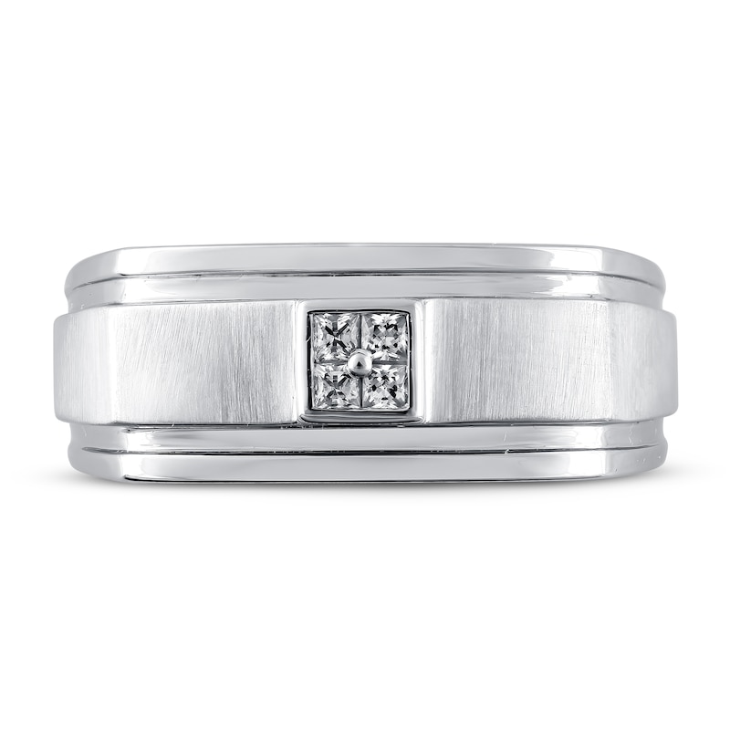 A quartet of beautiful square-cut diamonds shine at the center of this handsome men's ring. The ring features a contrasting satin and high-shine finish of 10K white gold for a unique look. The ring has a total diamond weight of 1/8 carat.