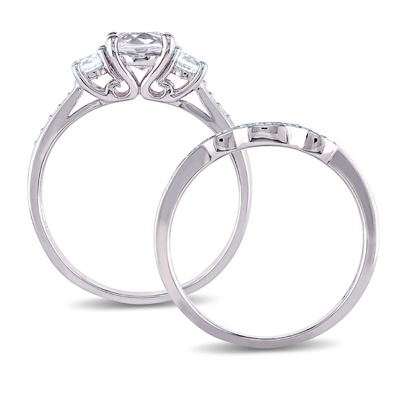 6.0mm Lab-Created White Sapphire and 1/8 CT. T.W. Diamond Three Stone Bridal Set in 10K White Gold