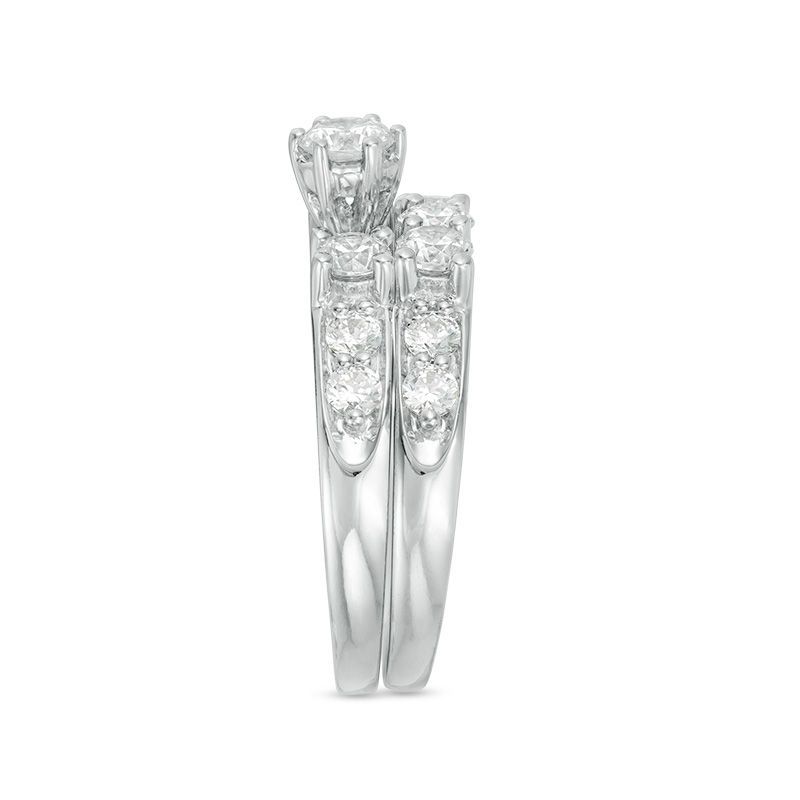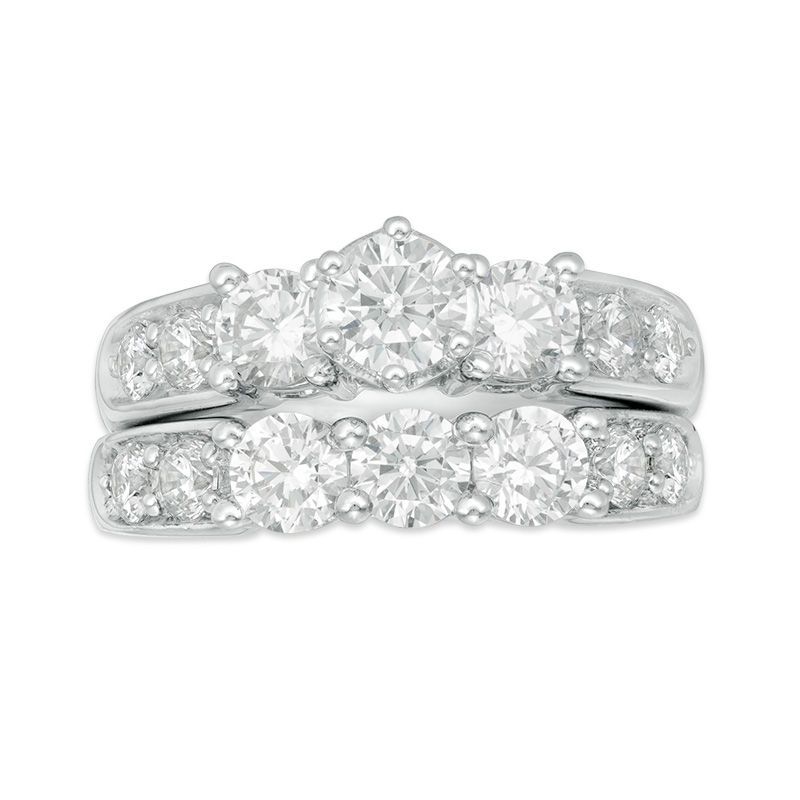 On the day you ask for her hand in marriage, honor her with a three stone diamond bridal set that honours love's past, present and future. Exquisite in 14K white gold, the engagement ring dazzles with three round diamonds as its focus. These three stones stand tall against a shank lined with accent diamonds. On the inside of the ring's shank, the words "Past, Present, Future" and two small round diamonds complete the look. On your wedding day, complete the ensemble with the coordinating wedding band, which also features three round diamonds flanked by round stones set into the shank. Radiant with 3 cts. t.w. of diamonds and a polished shine, this ring is an amazing look for an amazing woman.